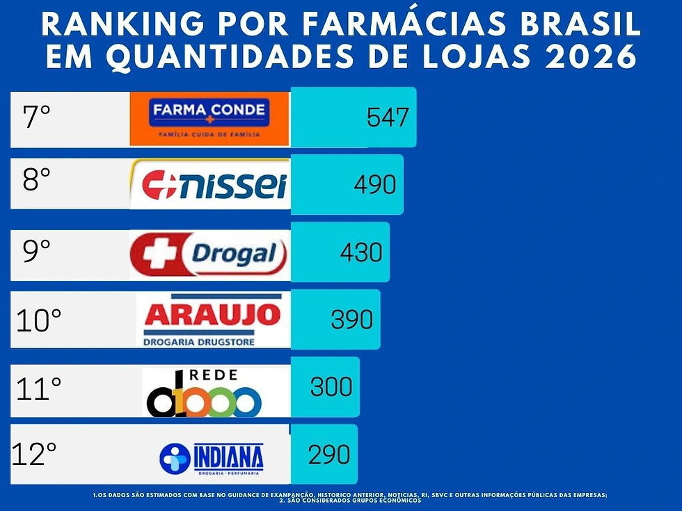 Apresento o ranking das principais redes de farmácias do Brasil em número de lojas.